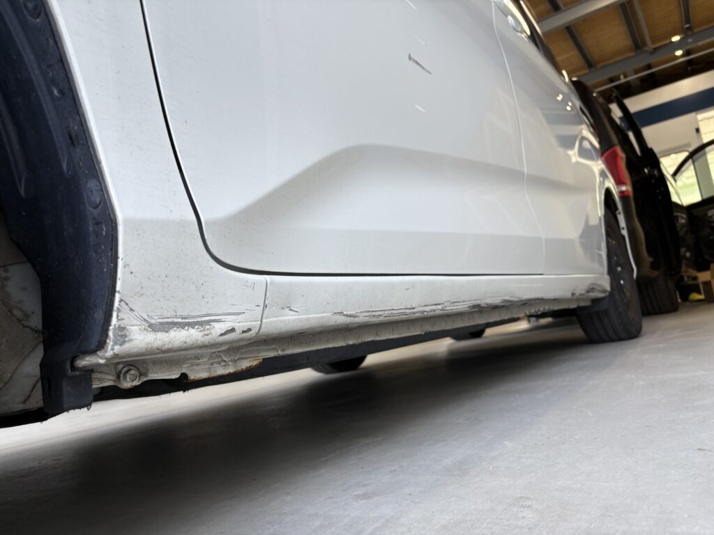 今回、修理のご依頼を頂きましたお車は多少の傷はきにしないアウトドア派のオーナー様ですが、、、サイドステップ下からがっつりやっちゃって錆とかは防ぎたくて、、、と御入庫頂いたのはフリードです😢!!